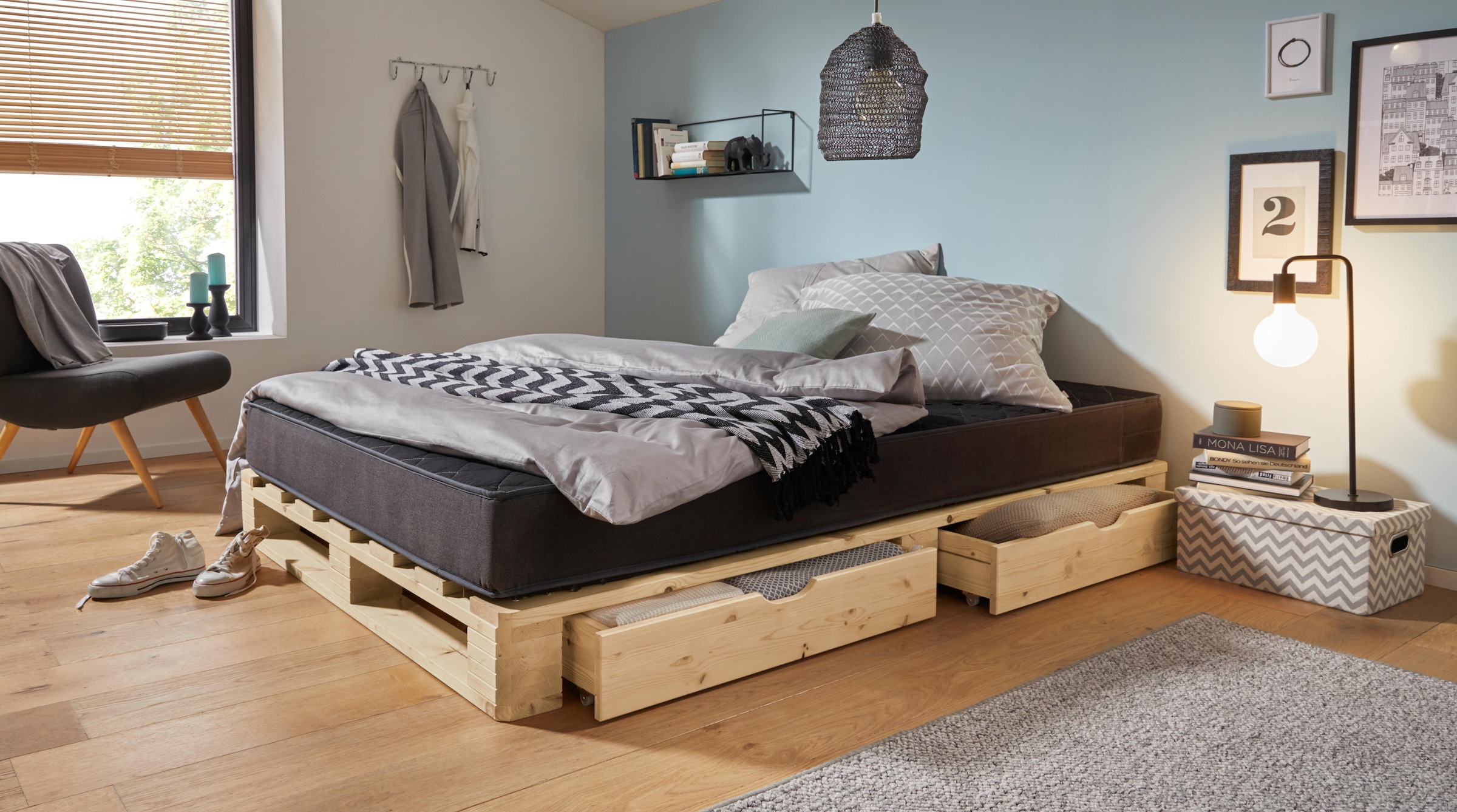 Ein bett aus paletten ist gerade bei jüngeren menschen sehr beliebt.